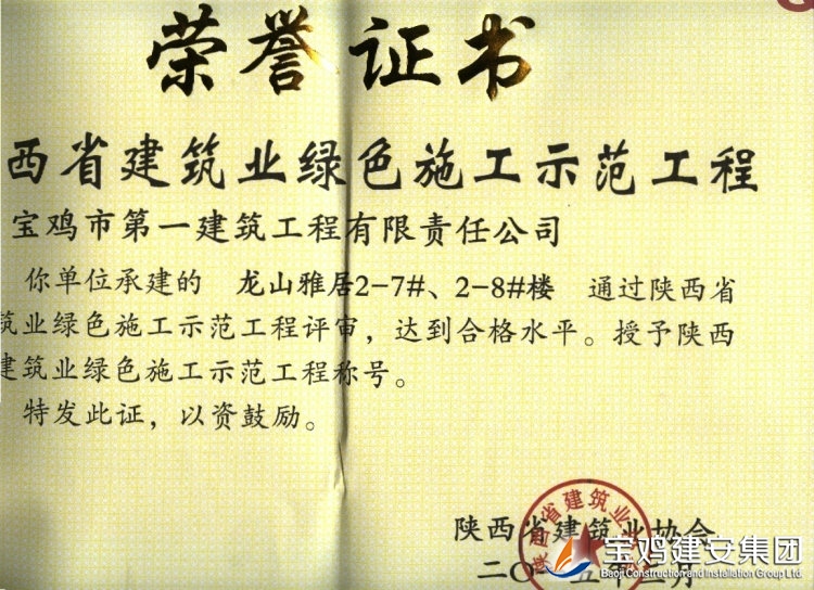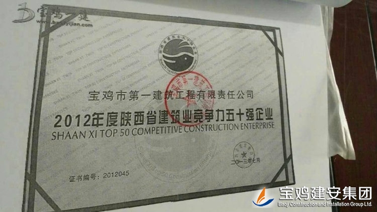 The company possesses a construction capacity of simultaneously engaging in cast-in-situ frame engineering more than 1700,000m2 and higher than 100m, and industrial plant and commercial facilities more than 30m in span, and annual construction area reaches more than 2,000,000m2. Since 1996, the company has been awarded as “abiding by contract, keeping promises” enterprise by Shaanxi People's Government, and national “abiding by contract, keeping promises” enterprise by the State Administration of Industry and Commerce in 2011 within the 10 years in succession; on January, 2006, the company successfully passed administration certifications of three systems, namely quality (ISO9001), environment (ISO14001) and occupational health & safety (GB/T28001).