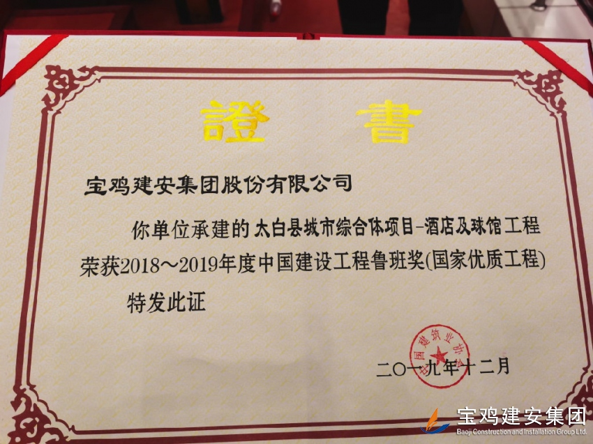 睽違三十載,喜開二度梅。12月10日,從北京會(huì)議中心傳來喜訊,由寶雞建安集團(tuán)承建的太白縣城市綜合體項(xiàng)目—酒店及球館工程,在全國建筑行業(yè)精品工程最高獎(jiǎng)項(xiàng)大比拼的激烈角逐中,力挫群雄,脫穎而出,最終摘得2018--2019年度中國建設(shè)工程魯班獎(jiǎng)(國家優(yōu)質(zhì)工程)桂冠,這也使寶雞建安集團(tuán)成為繼法門寺重建工程獲得寶雞第一個(gè)建筑魯班獎(jiǎng)后,時(shí)隔近30年再次奪得“魯班獎(jiǎng)”的企業(yè),從而書寫了建筑行業(yè)頂級獎(jiǎng)“梅開二度”的傳奇!