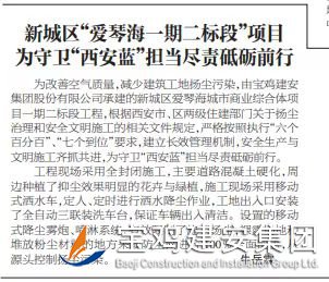 為改善空氣質(zhì)量,減少建筑工地揚塵污染,由寶雞建安集團股份有限公司承建的新城區(qū)愛琴海城市商業(yè)綜合體項目一期二標段工程,根據(jù)西安市、區(qū)兩級住建部門關于揚塵治理和安全文明施工的相關文件規(guī)定,嚴格按照執(zhí)行“六個百分百”、“七個到位”要求,建立長效管理機制,安全生產(chǎn)與文明施工齊抓共進,為守衛(wèi)“西安藍”擔當盡責砥礪前行。