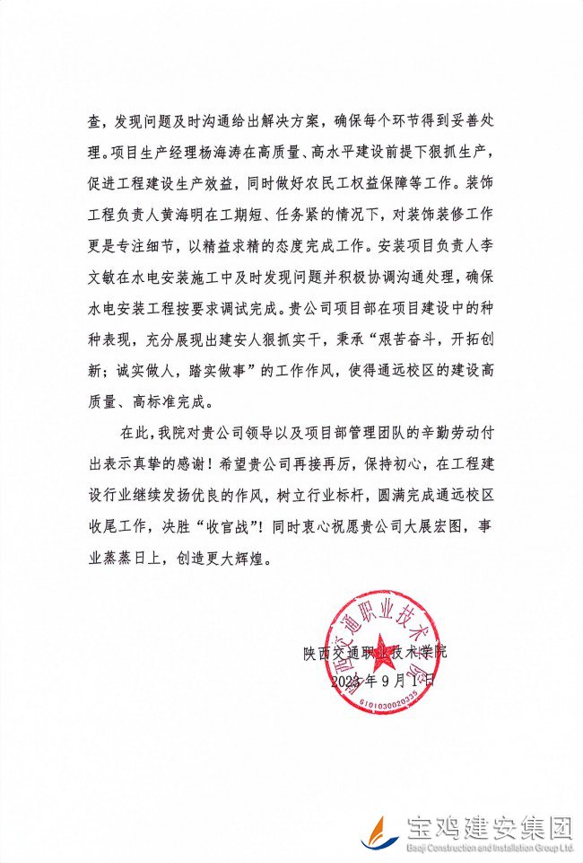 據(jù)悉,陜西交通職業(yè)技術(shù)學(xué)院新校區(qū)一期建設(shè)項(xiàng)目【EPC】一標(biāo)段建筑面積為48200.59平方米,工程造價(jià)3.4億。合同工期為2021年11月25日至2023年7月7日總工期600天,實(shí)際開(kāi)工日期為2022年5月4日,經(jīng)過(guò)一年多的施工,現(xiàn)已完成教學(xué)樓和室外工程全部施工內(nèi)容,并于2023年9月1日正式投入使用。